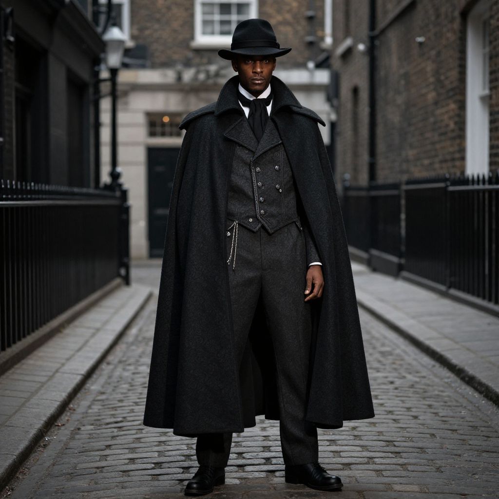 A mysterious, elegantly dressed Black man in a long flowing cape and Sherlock Holmes hat stands in a dimly lit, cobblestone London alley.