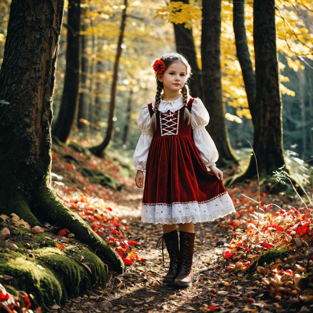Photorealistic image of a young girl standing on a forest path during autumn. She wears a red dress with white lace and puffed sleeves, brown laced black boots, and has long braids adorned with a red flower hair accessory. The forest background features yellow and brown leaves, moss-covered tree trunks, and soft natural sunlight creating a peaceful fairy tale atmosphere.