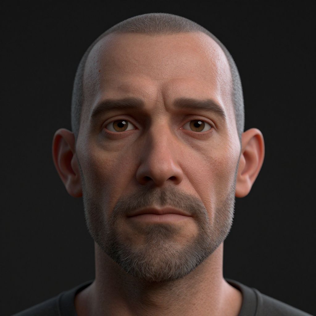 Man3d, realistic 3D portrait of a middle-aged man with stubble and expressive eyes, ultra-detailed skin pores and hair strands, dramatic studio lighting, soft shadows, minimalistic dark background for strong contrast