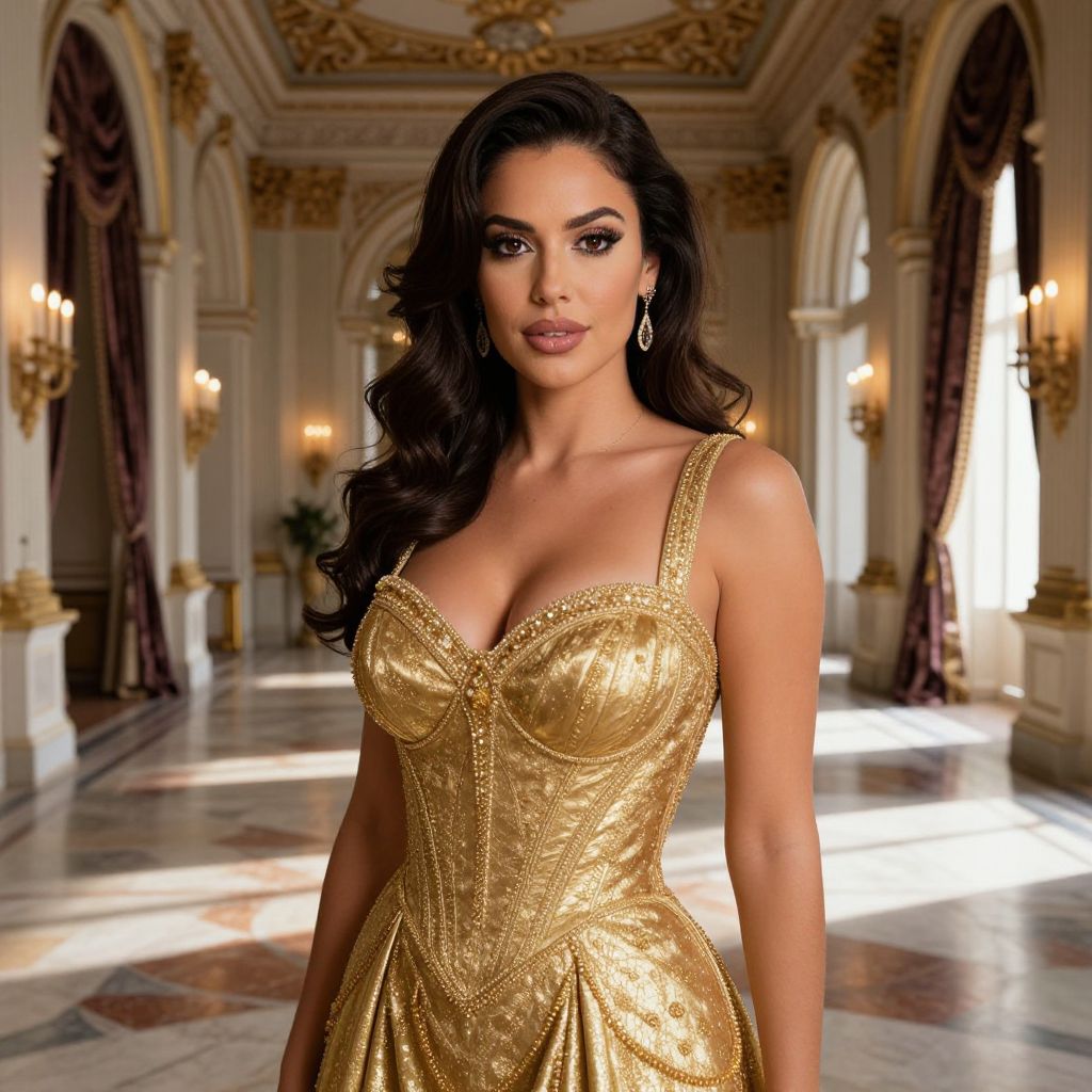 A glamorous woman with deep brown eyes and a defined facial structure wears a lavish formal gold dress as part of a costume for a royal-themed gala; she stands in a majestic palace hall with ornate arches, velvet drapes, and candlelight casting long shadows on elegant marble floors. The woman has big breasts and cute face