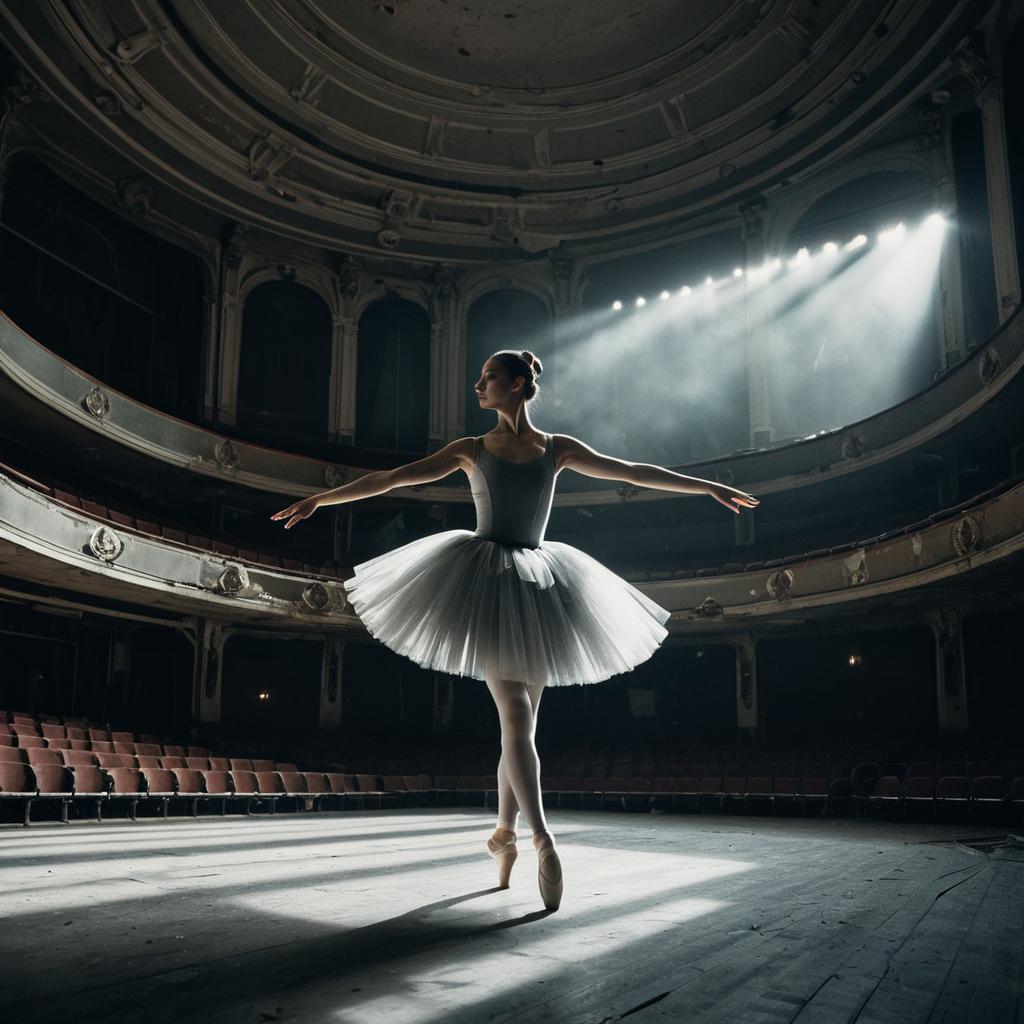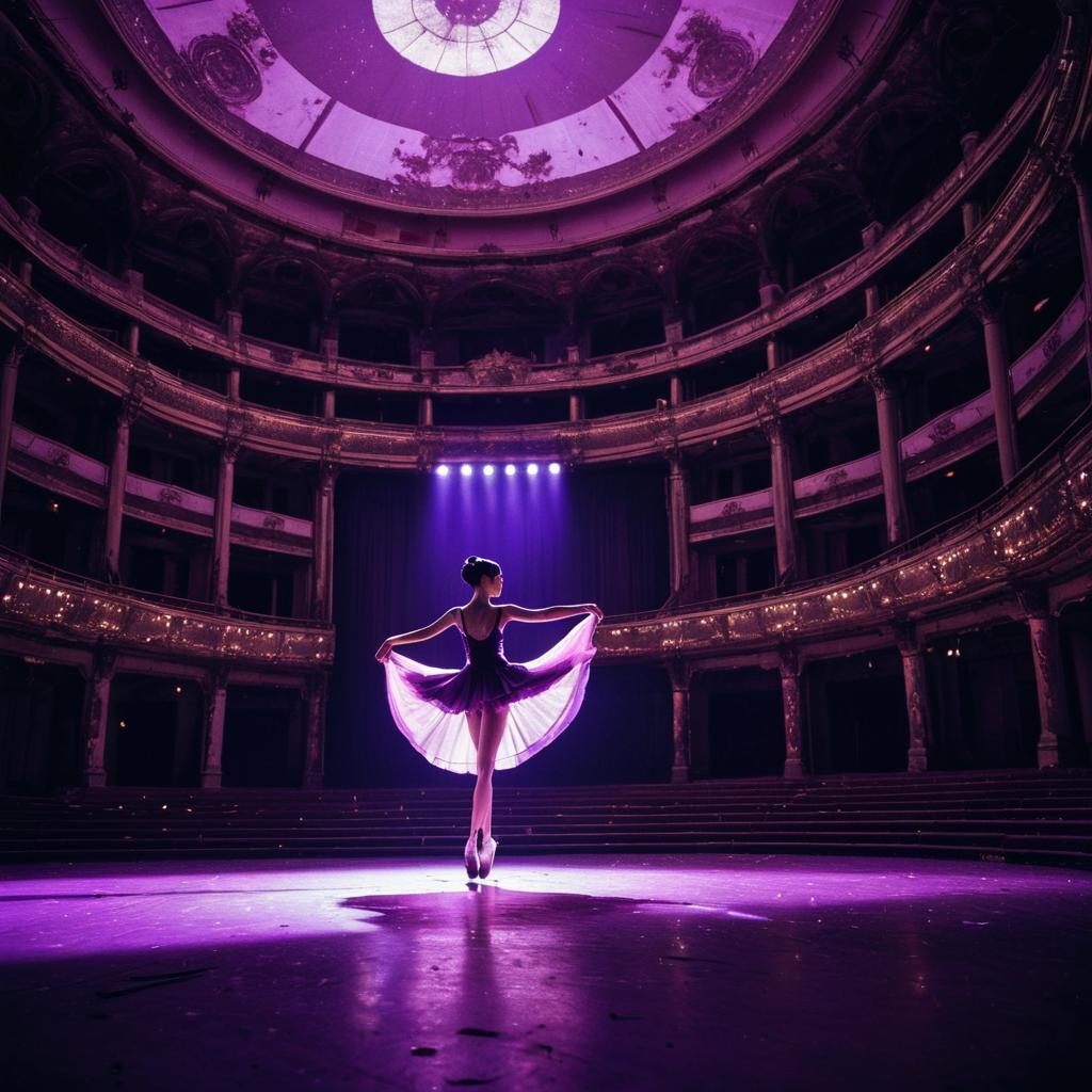 A slender female ballet dancer stands en pointe on the stage of an abandoned opera house. She wears a shimmering silk dress that glows under soft, diffused pink and purple spotlights. The grand, multi-tiered theater interior is ornately detailed but shows signs of decay. The image conveys a dramatic, cinematic atmosphere with a poetic, Wong Kar-wai inspired aesthetic.