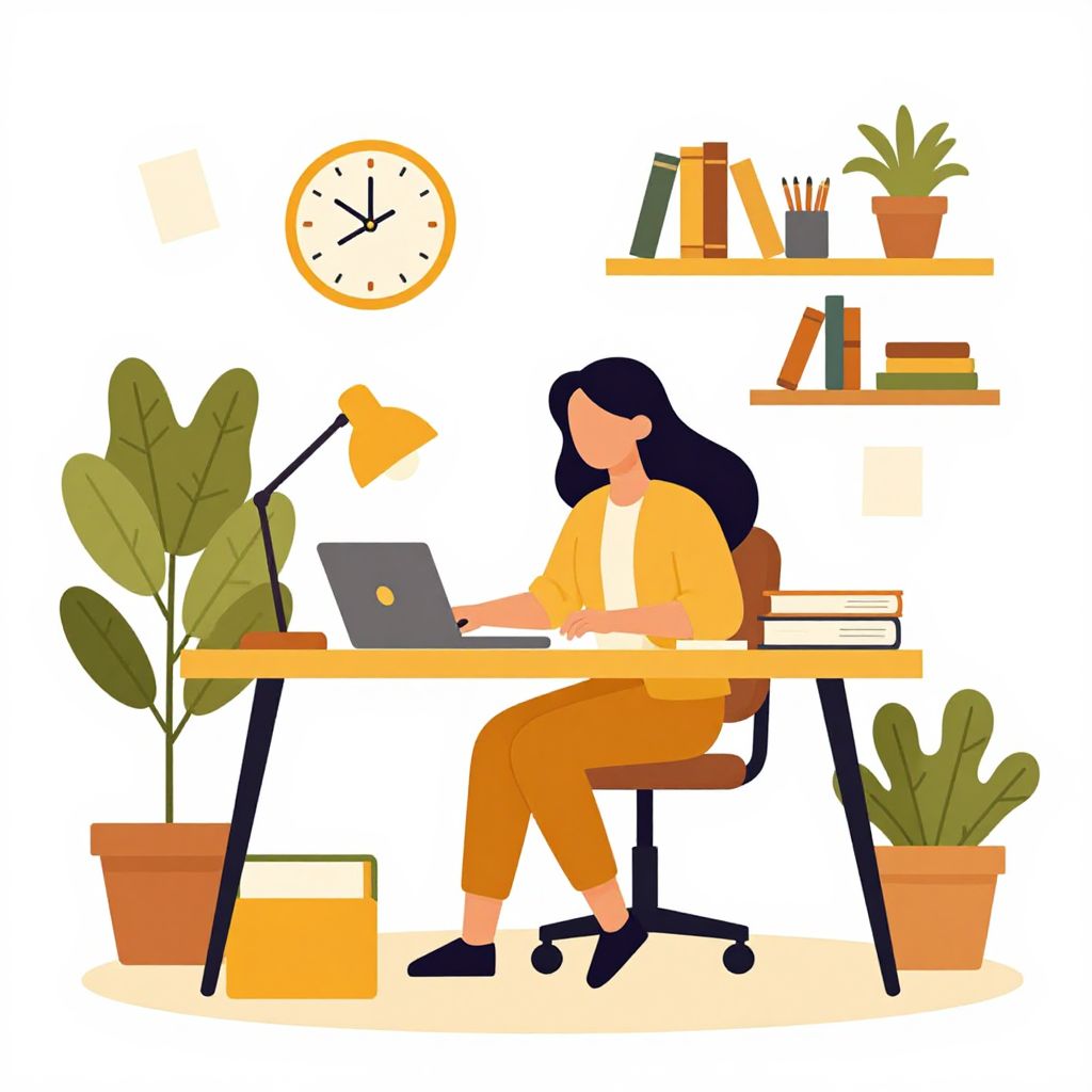This digital illustration depicts a woman with long black hair, wearing an orange shirt and pants, seated at a modern wooden desk with black legs. She is typing on a silver laptop, with a yellow desk lamp beside it. The desk also holds a closed book on her right. Above her, a round clock with black hands and a white face shows 3:00. To the left, a large green potted plant stands, and to the right, another potted plant is visible. A shelf above the desk holds books and a small potted plant. The background is white, emphasizing the colorful, minimalist style of the illustration.