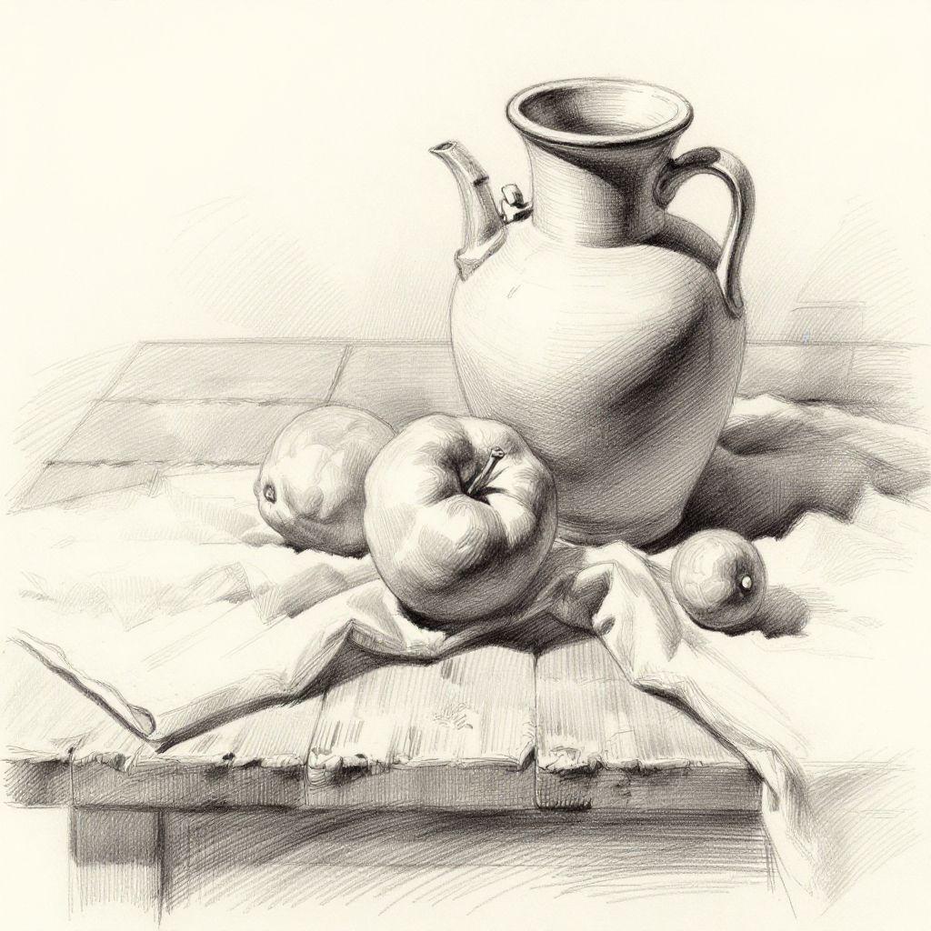 Monochrome pen and ink drawing of a ceramic jug, two apples, and two lemons on a cloth, with a wooden table background.