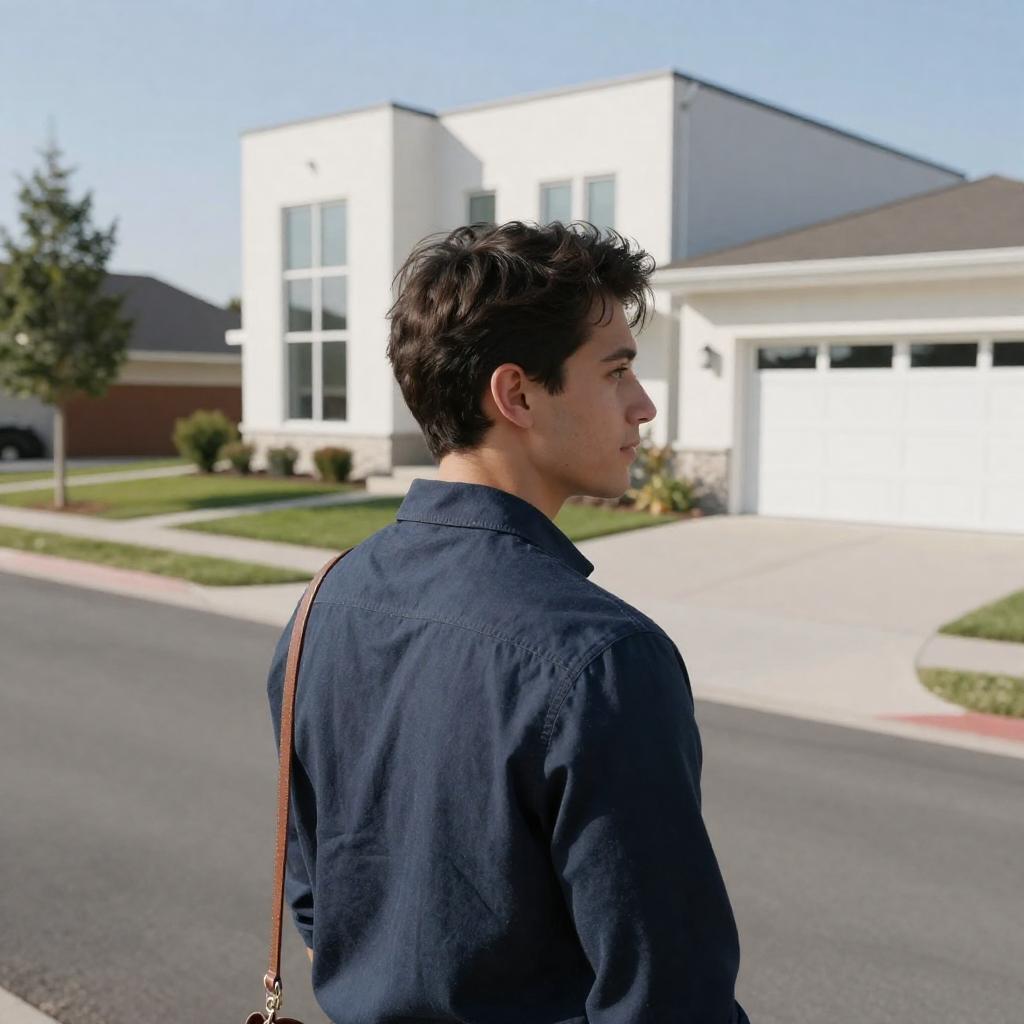 Photograph of a young man with short dark hair, wearing a dark blue shirt and brown leather strap, standing in a suburban driveway. He faces right, with a modern white building and garage in the bright background. Trees and a house with a dark roof are visible in the distance.