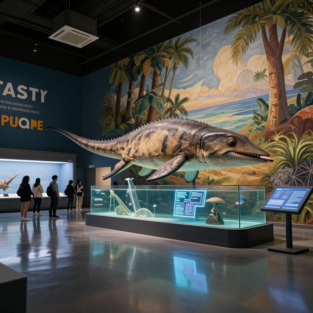 Futuristic museum exhibit showcasing a lifelike plesiosaurus model inside a glass tank, visitors admiring from a distance, shiny polished floors reflecting lights, interactive holographic info displays, blending science and art in hyper-realistic digital painting style.