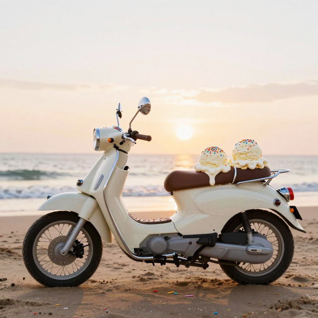 Ice cream motorcycle parked by the beach, dripping scoops on the seat, colorful sprinkles everywhere, sun setting in the background, surreal fantasy art style