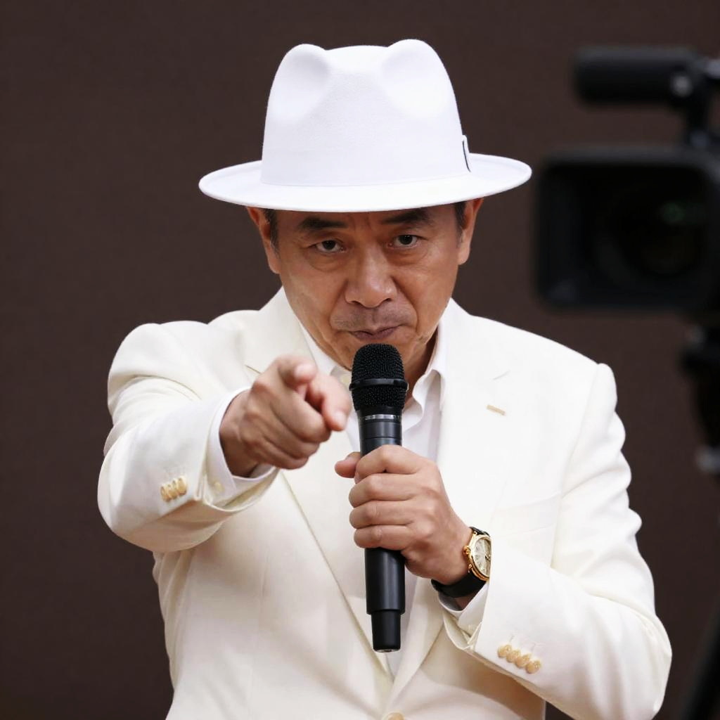 Middle-aged Asian man with white fedora, white suit, and gold watch, aiming black microphone forward, intense expression. Large video camera in background, right side. Dark brown background, subtle lighting. Single person, focused pose.