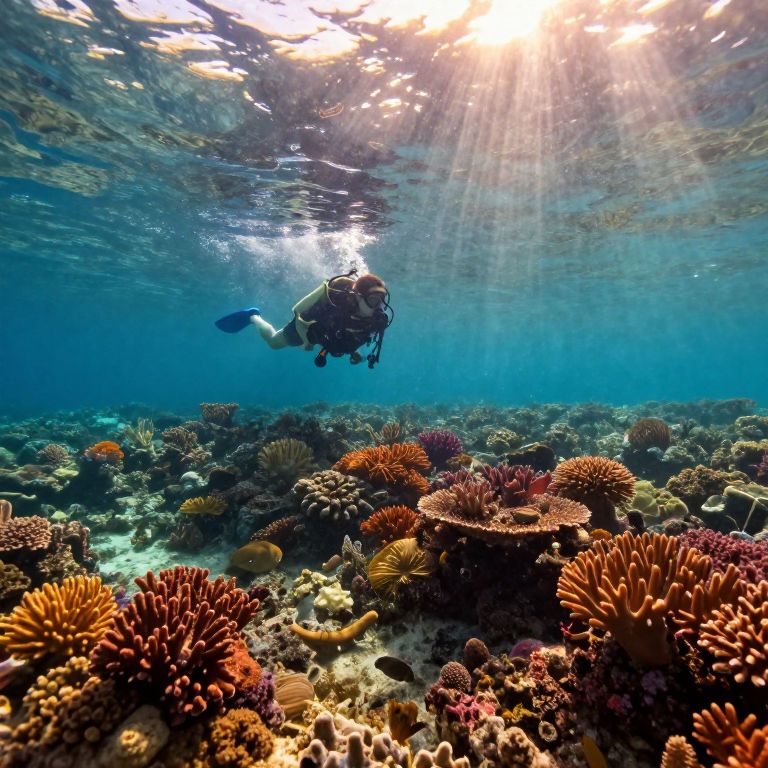 Scuba diver explores vibrant coral reef beneath sunlight rays; colorful corals and marine life in clear, blue ocean water. Photographic image.