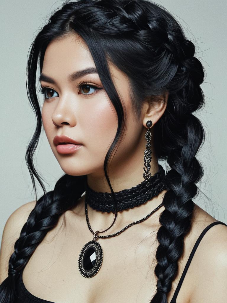 Rapunzel braid black, 1girl, solo, realistic, earrings, jewelry, black hair, choker, braid, long hair, lips, photorealistic, portrait
