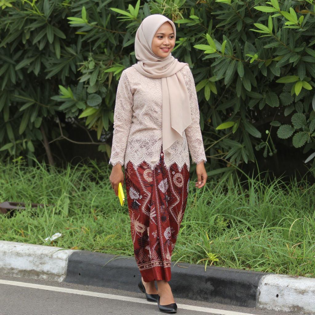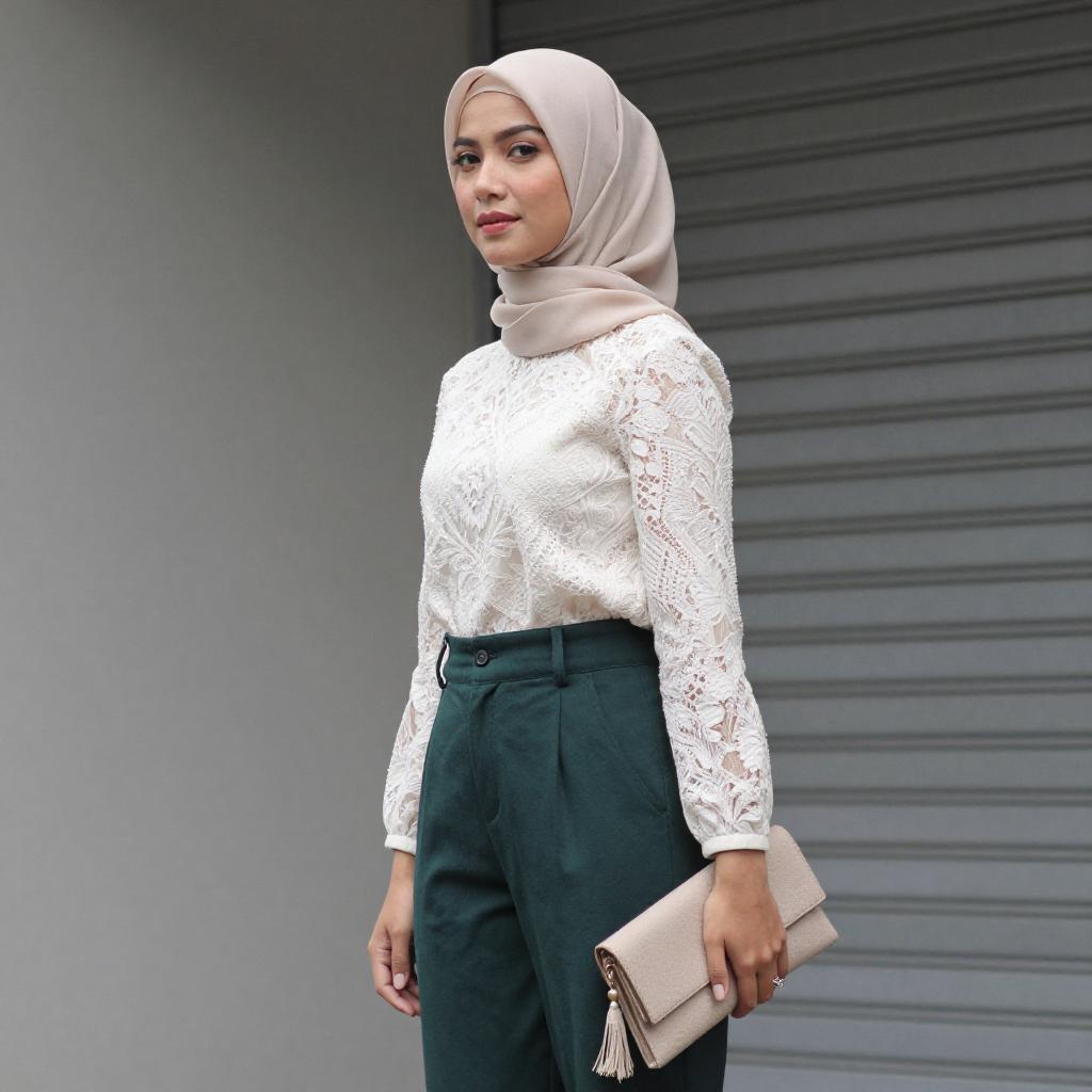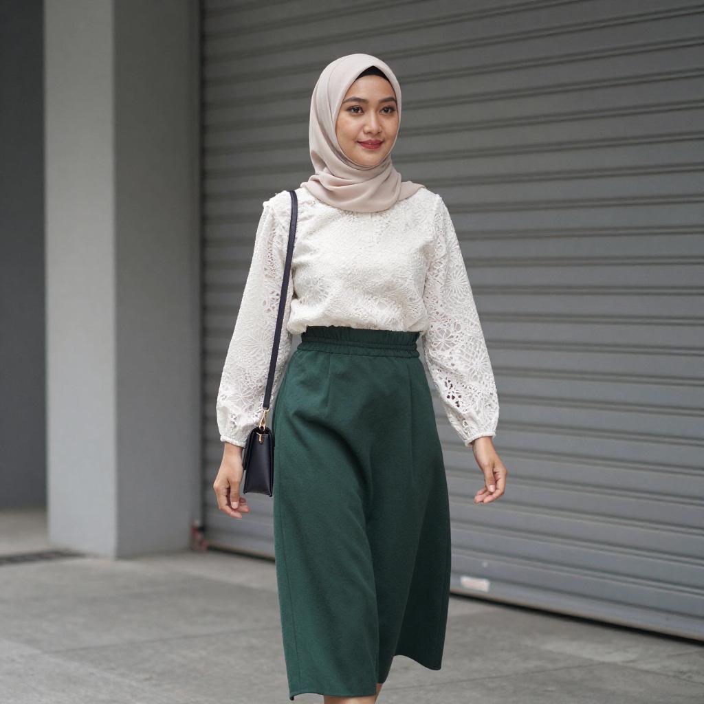 Photograph of a young woman with light skin and red lipstick, wearing a beige hijab, beige and gold embroidered top, and white patterned pants. She stands in front of a wire mesh structure with greenery in the background, holding a black and white patterned bag.