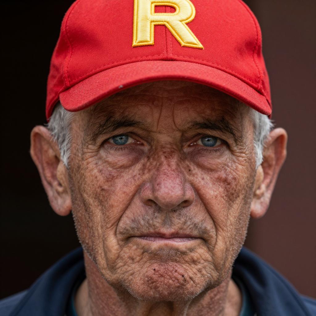 Close-up low-angle portrait of an elderly man with a wrinkled face, gray hair, and sharp eyes. He is wearing a green jacket and a matching green cap, yelling with his mouth open and finger pointed forward. The background features a brown wooden ceiling with curved lines.