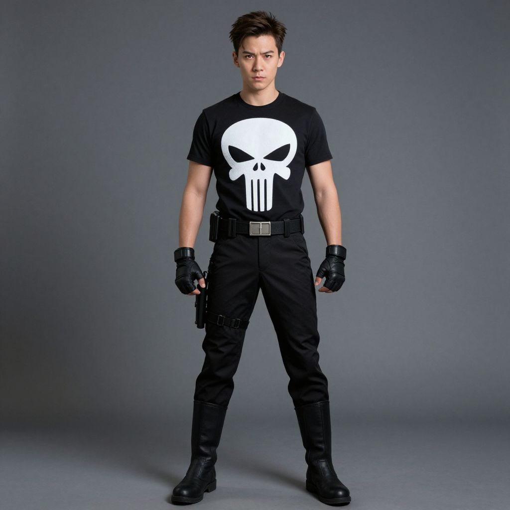 Punisher costume, 1boy, male focus, solo, fingerless gloves, gloves, boots, pants, full body, standing, shirt, belt