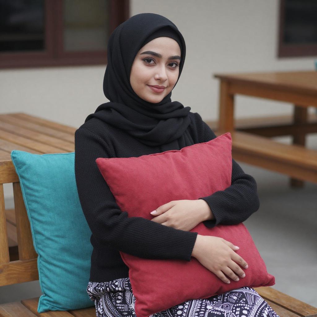 Photograph of a young woman with light skin and red lipstick, wearing a light purple hijab and a beige ribbed long-sleeve top. She sits on a dark purple tufted couch, holding a dark blue pillow, with gray curtains in the background. She has a calm expression and is slightly turned to her right.