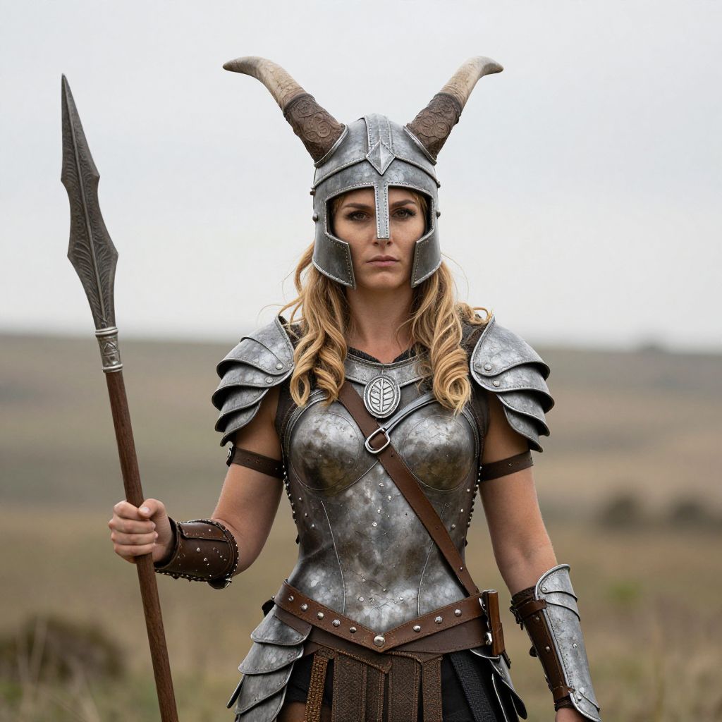 Photograph of a blonde woman in Viking armor with horns, holding a spear, standing in a grassy, hilly landscape.