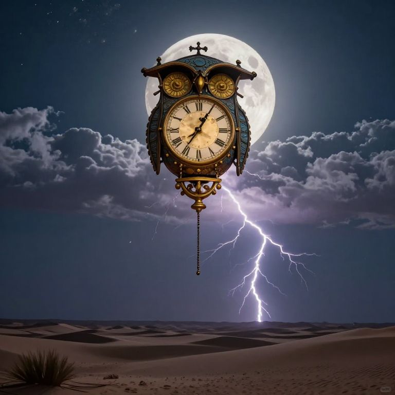 Suspended between eternity and transience, a colossal cuckoo clock stands sentinel in a desert expanse, its golden face illuminated by the ethereal glow of a moonlit sky, while lightning forks and swirling clouds evoke a symphony of time's relentless march and nature's untamed power.