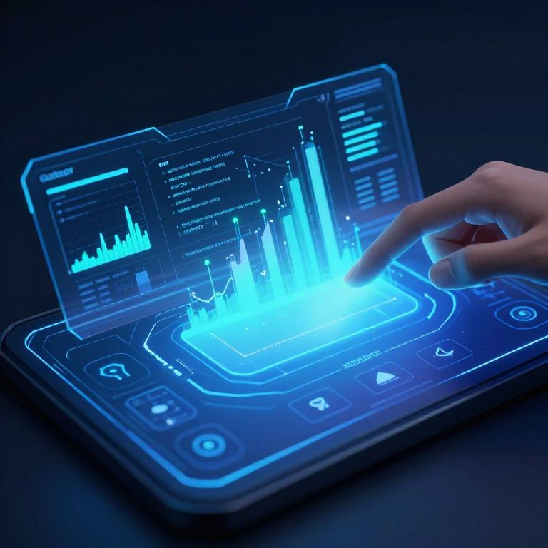 Photograph of a glowing blue holographic tablet displaying financial charts, with a hand interacting with the digital interface.