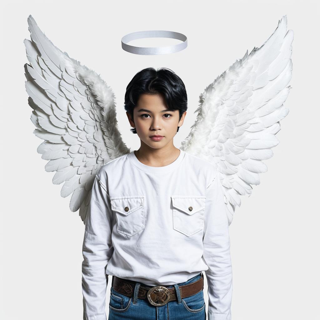Fancy angel costume,halo,solo,1boy,wings,male focus,angel,angel wings,looking at viewer,black hair,hand in pocket,long sleeves,white background,simple background,cowboy shot,realistic