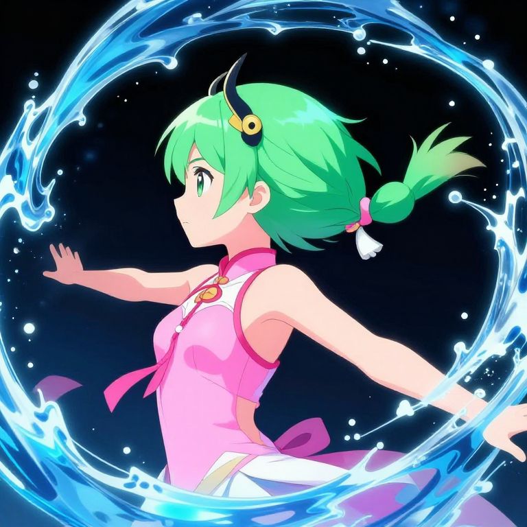 Anime-style digital artwork of a green-haired girl in a pink outfit, surrounded by a glowing blue water circle against a black background.