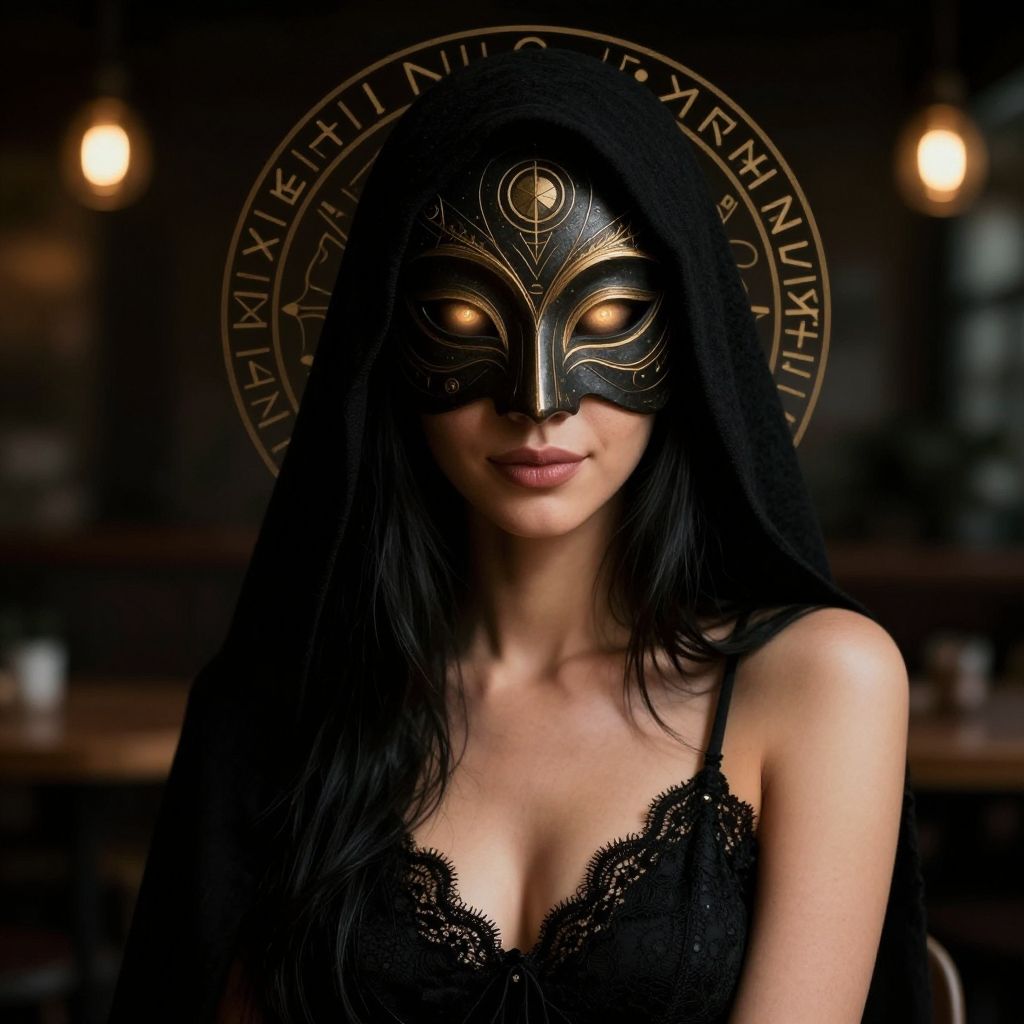 Photograph of a woman with long black hair and light brown skin, wearing a black lace camisole and an ornate black mask with gold accents and a central eye design. The mask covers her upper face, revealing only her lips and the glowing gold eyes. She stands against a dark, blurred background with circular golden text and two out-of-focus lights. The overall mood is mysterious and slightly gothic, with a focus on the intricate mask and her serene expression. The lighting highlights her face and mask while keeping the background dim.
