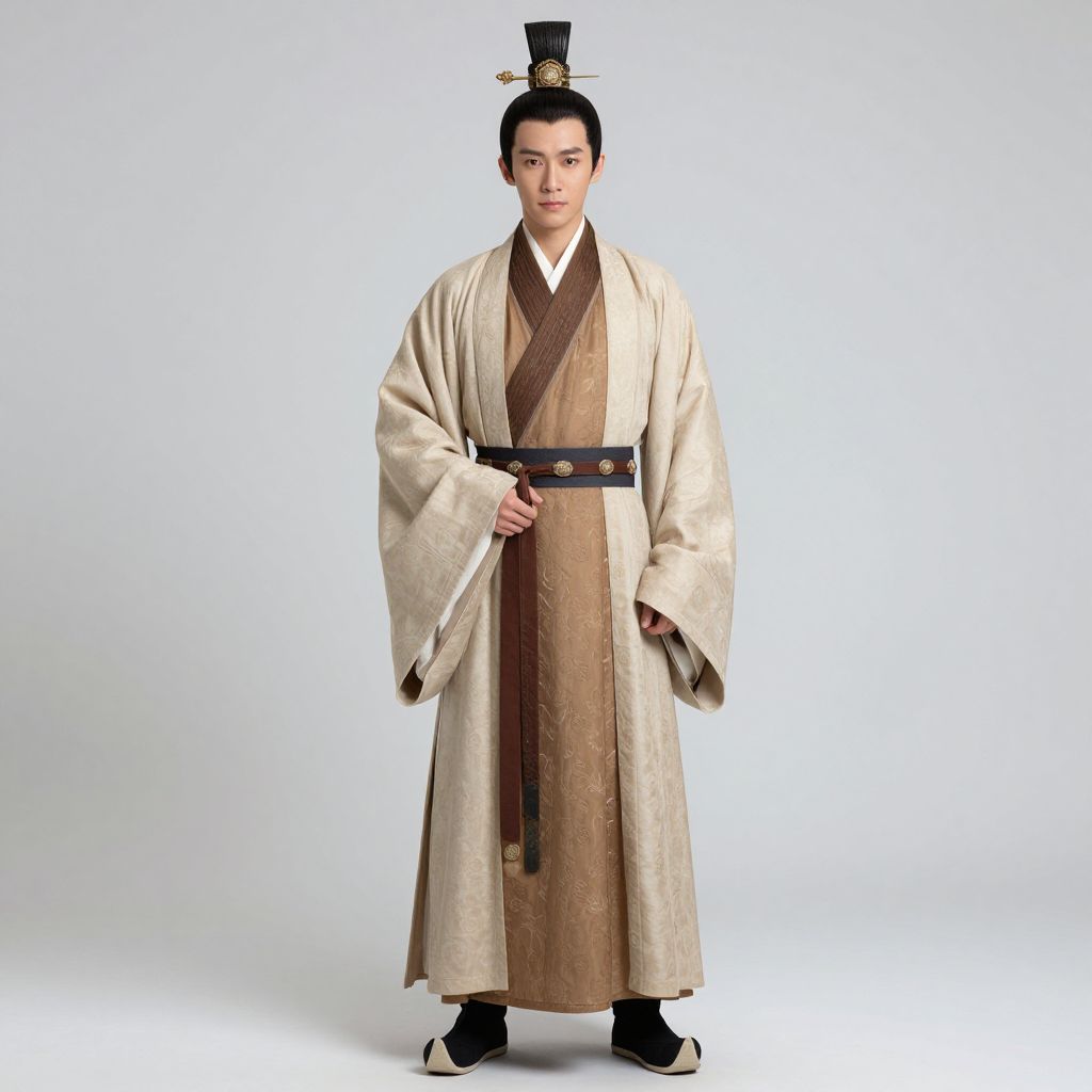 Photograph of an East Asian man in traditional beige and brown Korean royal attire, standing against a plain white background, with black shoes and a black hat