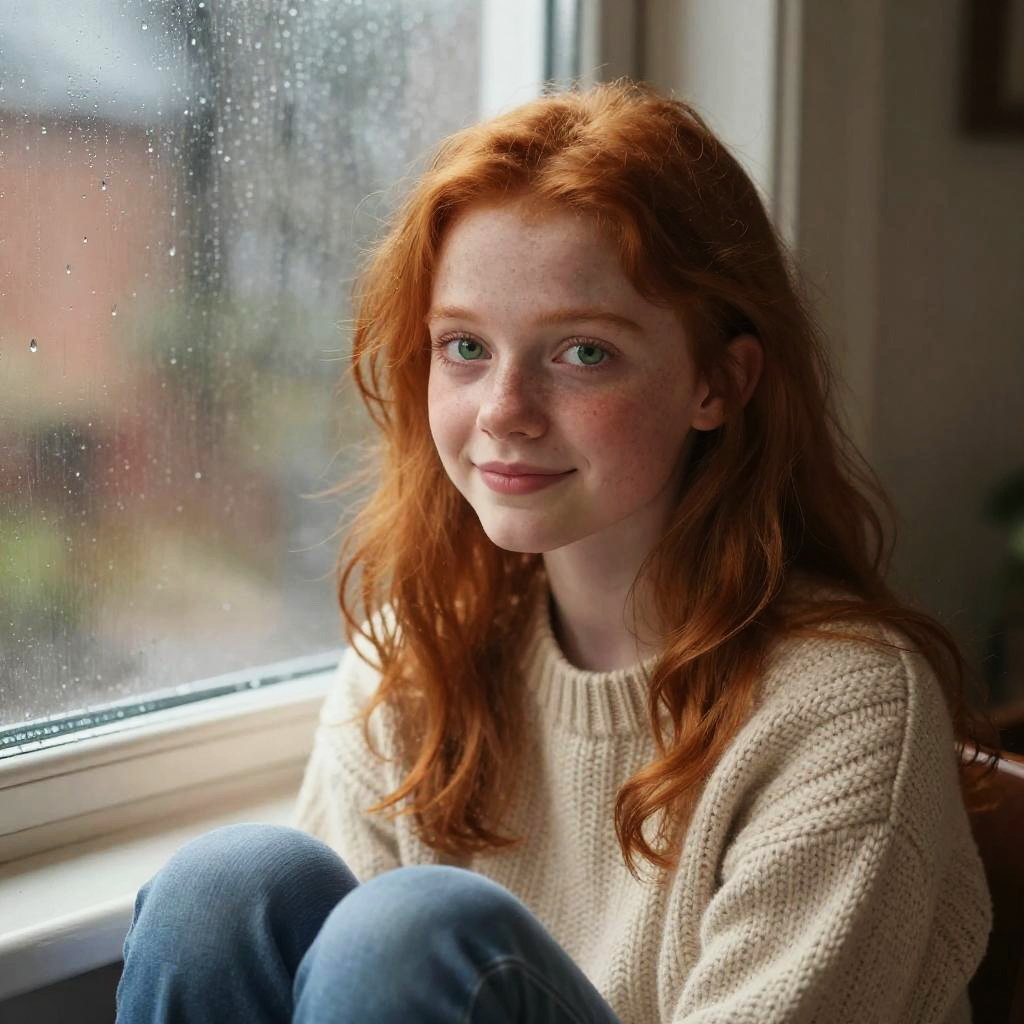 Portrait of a teen girl with red hair and green eyes, wearing a cozy knitted sweater, sitting by a window on a rainy day, soft natural light illuminating her expressive face, slight smile, intimate and warm mood, detailed digital painting.
