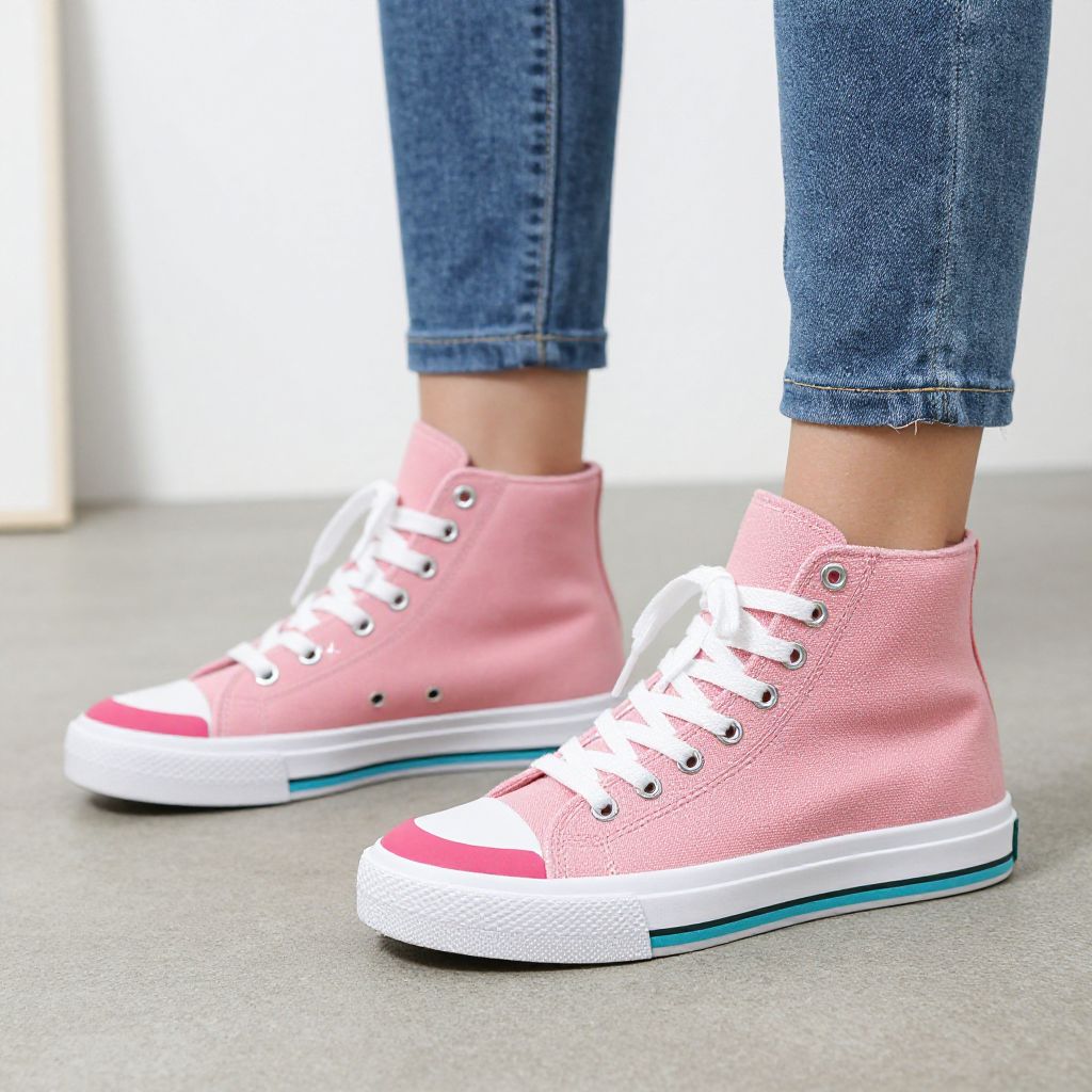 Photograph of a person's lower legs wearing light pink, high-top, canvas sneakers with white laces and white rubber soles that have a teal underside. The sneakers feature silver eyelets and a textured fabric. The person is wearing blue, slightly frayed denim jeans with the hem rolled up to mid-calf. The background is a plain, light gray floor with a blurred white wall. The overall style is casual and modern, with a focus on the shoes. The image is brightly lit, emphasizing the pastel pink color of the sneakers.