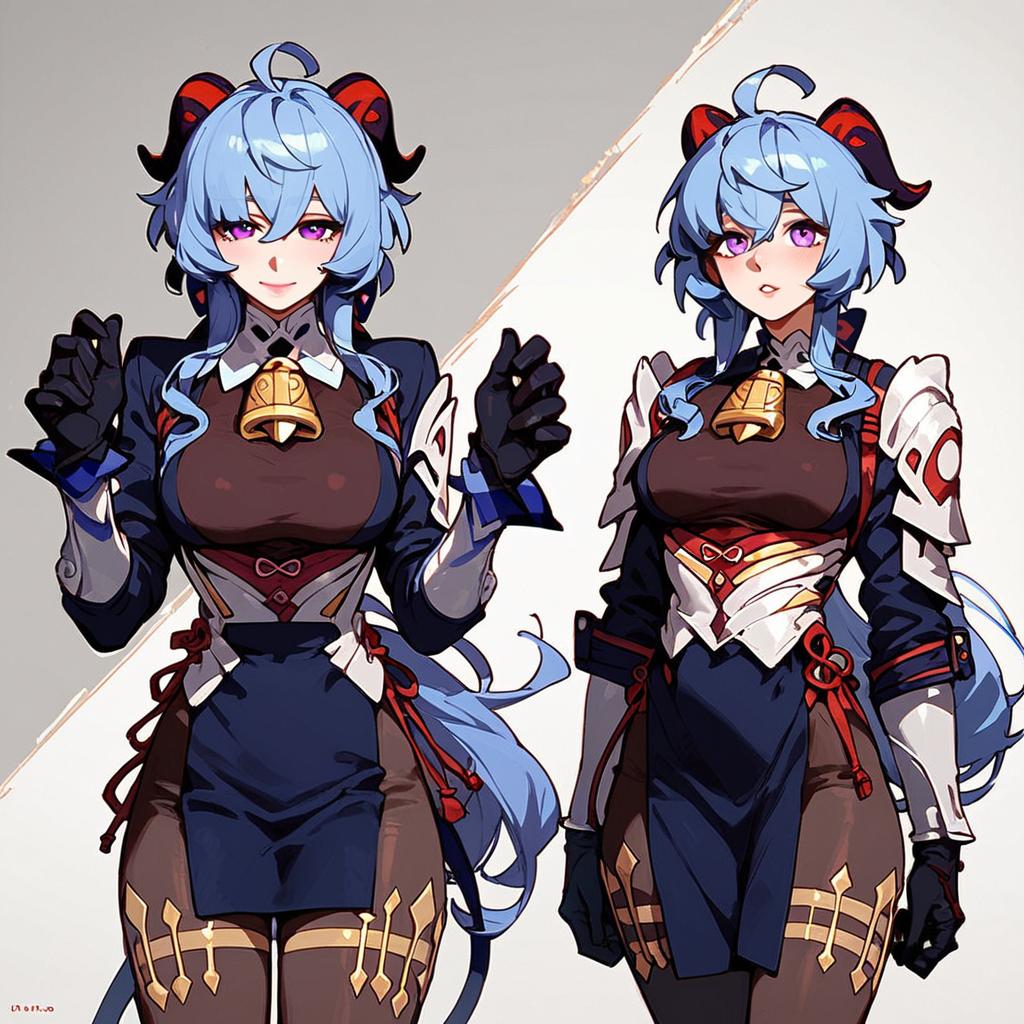 (anime, 1 girl, solo), (score_9, score_8_up, score_7_up, score_6_up, score_5_up, 2.5d), (ganyu face, small horns), cowboy shot, alternate costume, standing, (helldiver, armor, gloves), multiple views, front and side, simple background, full body