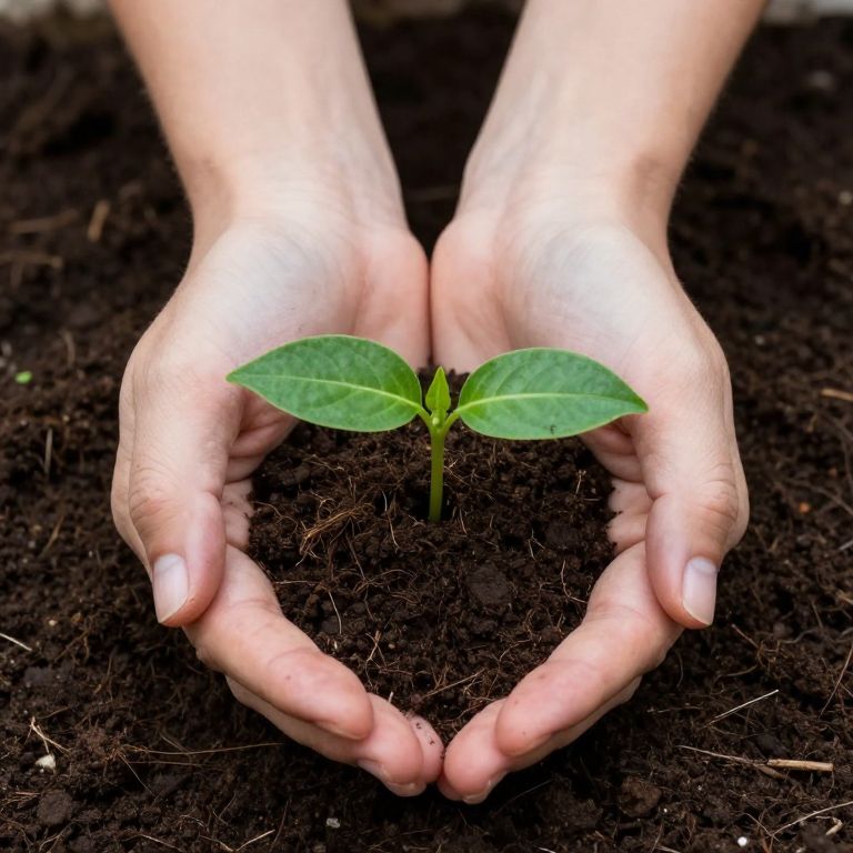Cupped hands gently cradle a vibrant green seedling emerging from rich, dark soil, symbolizing growth and care.