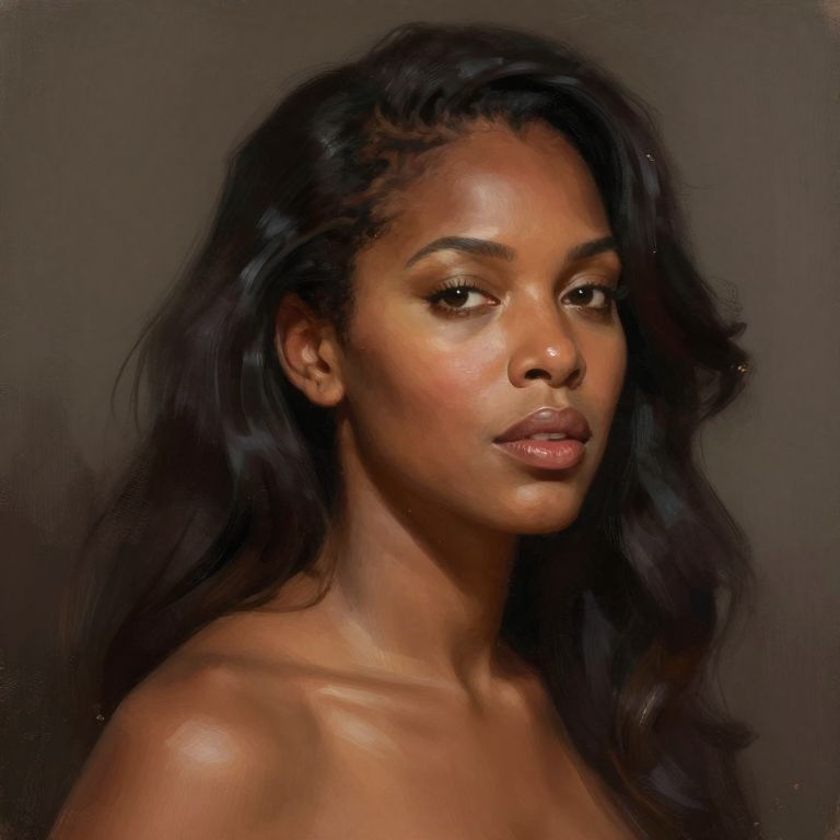 Digital portrait of a beautiful, dark-skinned woman with long, wavy black hair and glowing skin, gazing confidently at the camera against a dark