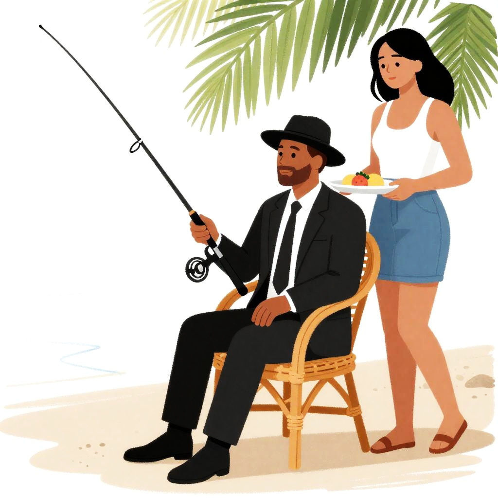 Drawing of two people. A man in a black suit, tie, and hat sits in a wicker chair holding a fishing rod. A woman in a white tank top and denim skirt stands beside him, carrying a tray. Background includes green palm leaves and a curled fish tail. Man smiles, woman looks down. Beach setting. Sandy ground under them.