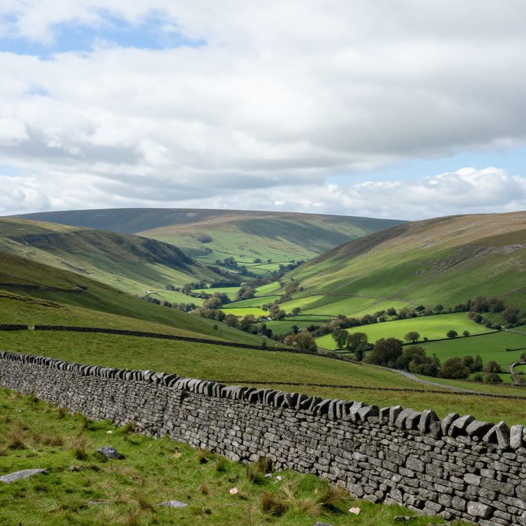 Photograph of a lush, green, rolling hill landscape with a stone wall in the foreground, under a partly cloudy sky.