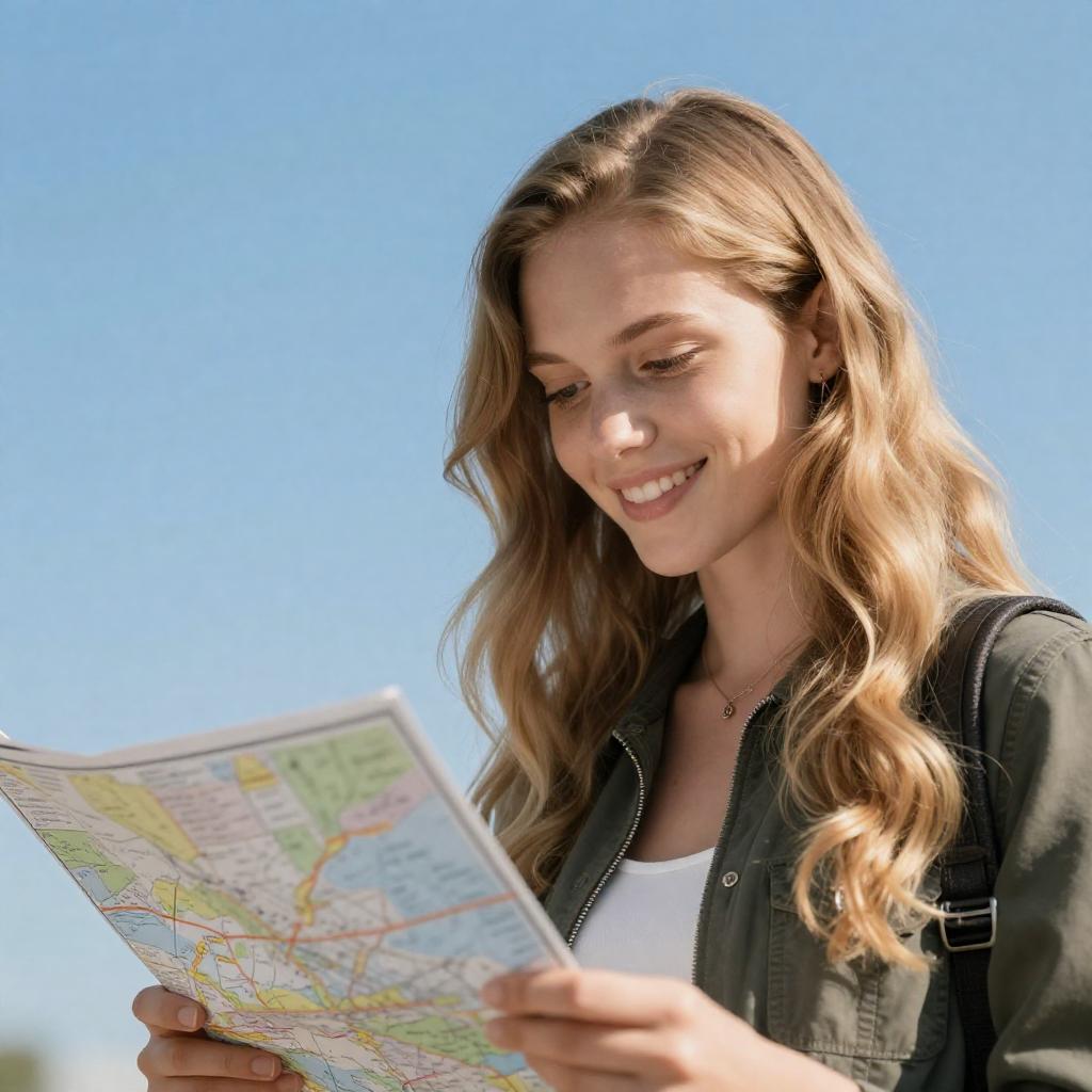Photograph of a smiling young woman with long, wavy blonde hair, looking down at a map. Sunlight illuminates her face, casting soft shadows. She wears a dark jacket, and the background is a clear, bright blue sky. The map is partially visible in the foreground.