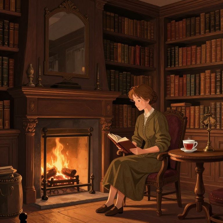 Mme illustrated in a cozy Victorian library, seated by a roaring fireplace, surrounded by tall bookshelves filled with ancient tomes, warm and rich earth tones, intricate woodwork, a cup of tea on a side table, calm introspective moment