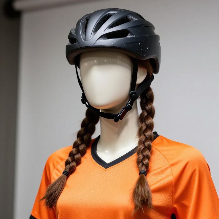 Mannequin wearing a helmet and orange jersey with braids in the hair.