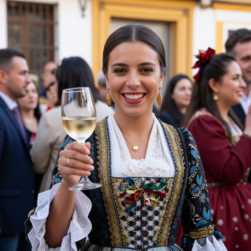Woman in traditional Sevillian attire smiles brightly while holding a glass of Fino wine, surrounded by friends during the Feria de Abril in Sevilla on April 30, 2017.