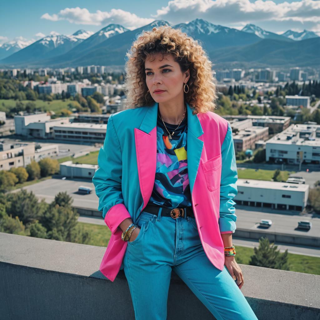 Portrait of an athletic woman with curly hair wearing an 80s-themed neon outfit featuring an oversized cerulean blazer with shoulder pads, bright pink top, and acid-wash skinny jeans. She is posing outdoors against a mountain and cityscape backdrop under a cloudy sky.