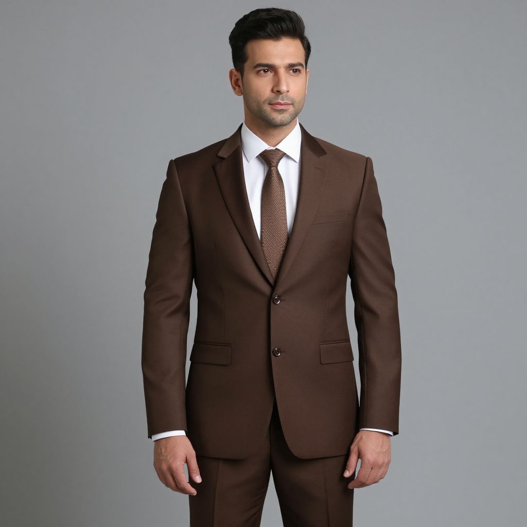 Pakistani Suit Costume, man in a brown suit and tie standing in a studio