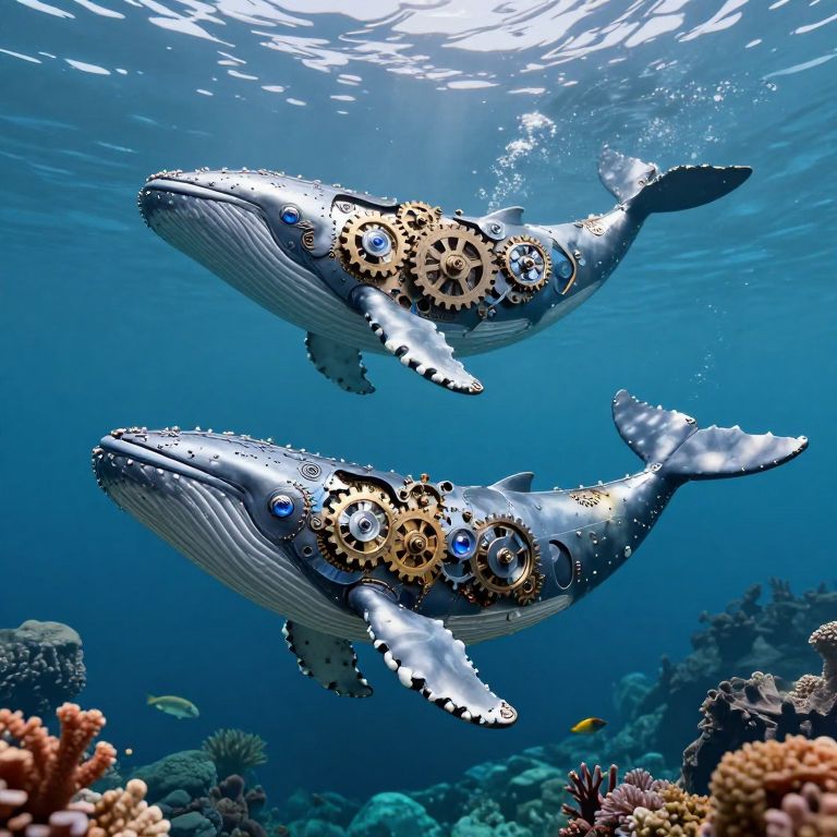 Two intricately designed clockwork whales glide gracefully through the ocean's depths, their metallic bodies adorned with ornate gears and glowing blue eyes, as they navigate past rocky coral formations under a serene sky above.