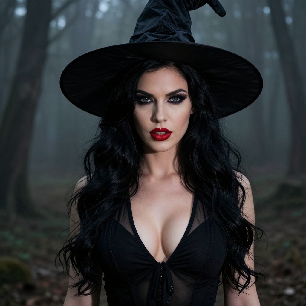 Photograph of a sexy woman dressed as a witch. She has long, wavy black hair, striking red lipstick, and is wearing a large black witch hat with a curved brim. Her black, sheer top reveals ample cleavage. The background is a misty, dark forest. She has pale skin and dark, dramatic eye makeup. The overall vibe is mysterious and seductive.