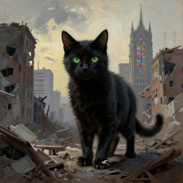 In the heart of a desolate city, a black cat with mangled claws stands as a sentinel, its piercing green eyes surveying the decaying urban landscape. The impressionistic style of the painting captures the essence of a forgotten, post-apocalyptic world, with buildings in various states of collapse and decay. The cat, with its rough, textured fur, appears both majestic and formidable, its claws a testament to its strength. The cityscape, a mix of warm and cool tones, is bathed in a soft, diffused light, creating a sense of melancholy and solitude. In the background, a towering structure with stained glass windows stands as a silent witness to the city's past, its spires reaching towards the overcast sky. The overall composition is dynamic, with the cat positioned centrally, drawing the viewer's eye through the scene and emphasizing the contrast between the feline's resilience and the city's crumbling beauty.