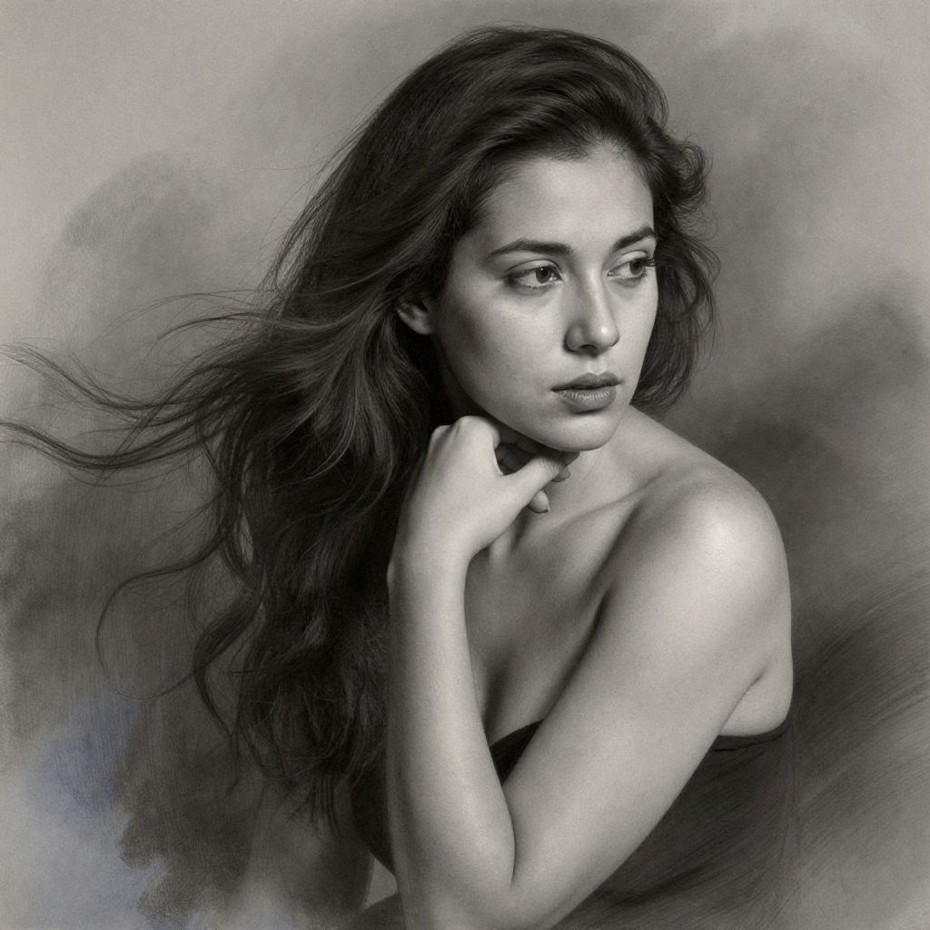 Charcoal portrait of a woman with flowing dark hair, captured in a contemplative pose against a soft, smoky background, rendered in meticulous detail with striking realism.