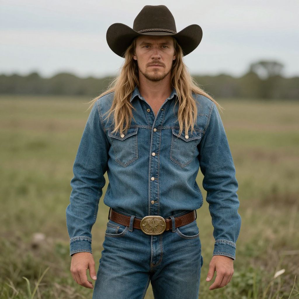 Man with long blonde hair wearing a cowboy hat and jeans.