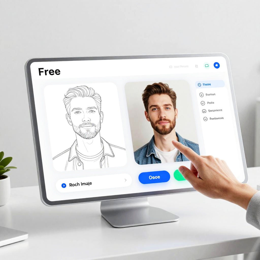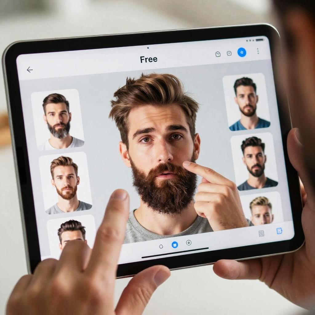 Close-up of a man using a beard app free on a tablet, experimenting with different beard styles in augmented reality, bright and dynamic digital overlay effects, detailed facial features, natural lighting highlighting the app’s capabilities.