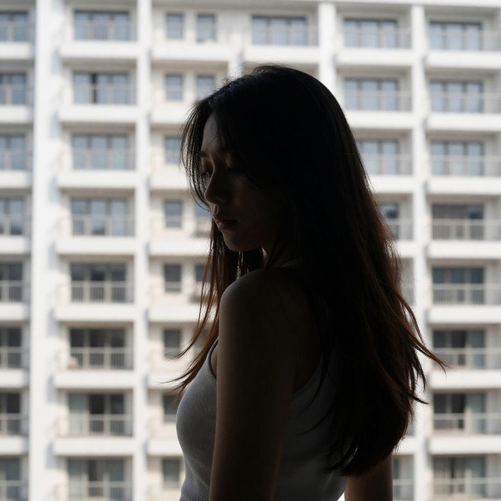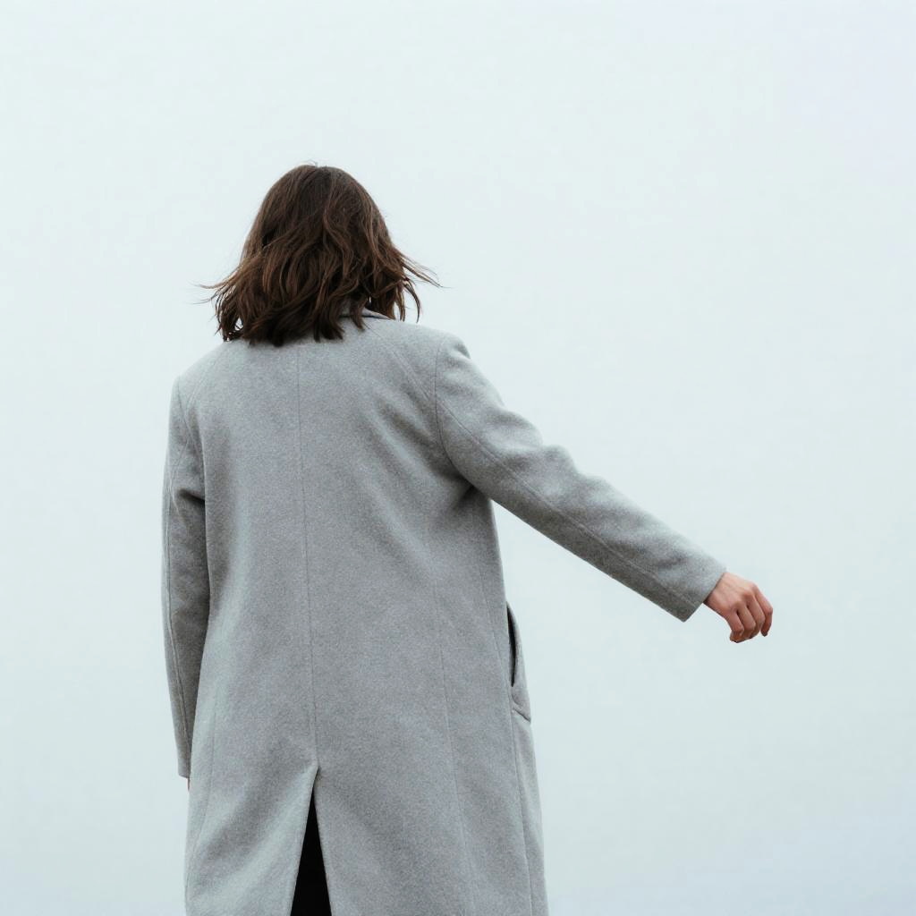 Photograph of a person with dark hair, wearing a beige coat and black pants, standing with arms folded against a metal railing. Foggy background with indistinct buildings and an airplane wing on the right. Person's back to camera. Overcast, rainy scene.