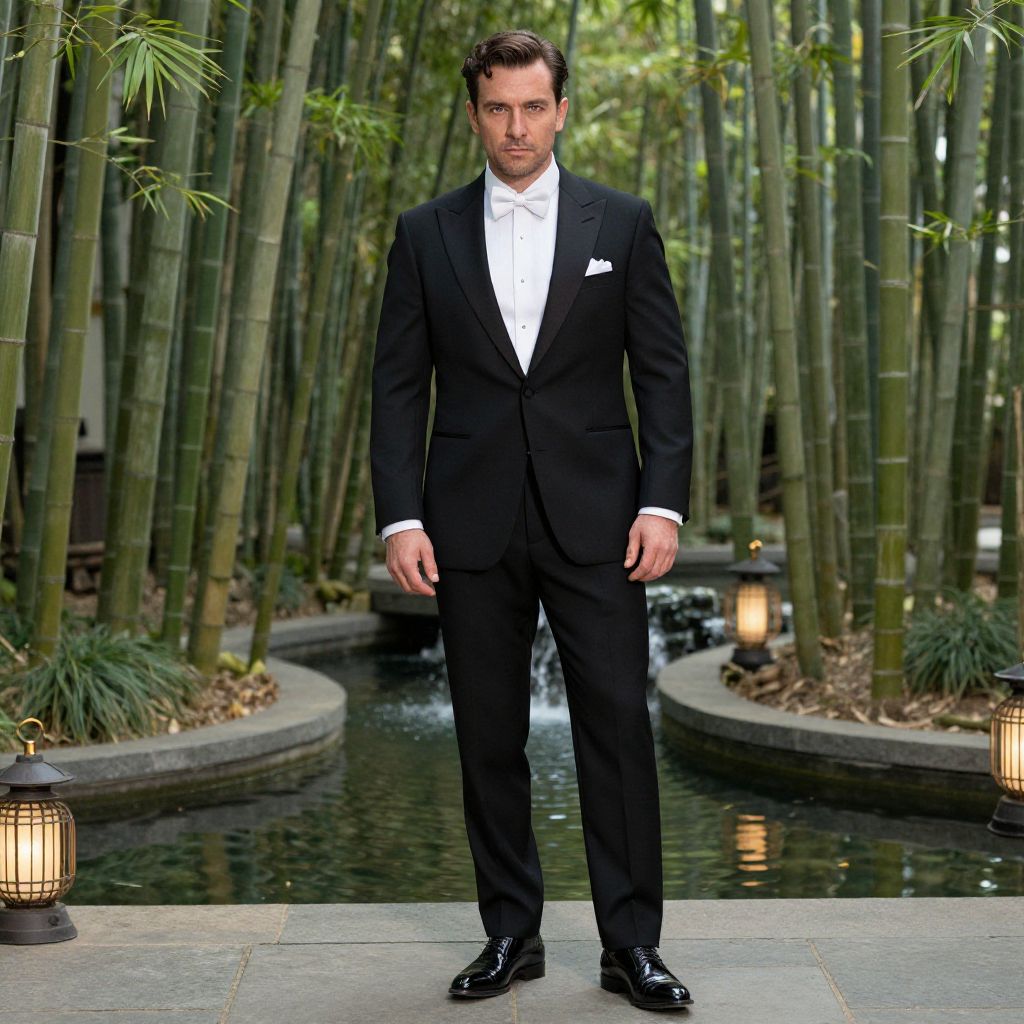 A man, tailored black tuxedo, satin lapels, crisp white dress shirt, classic white bow tie, polished black leather shoes, silk pocket square, lush bamboo grove, tranquil water features, delicate lanterns, cinecolor, confident expression Man has masculine face and piercing eyes