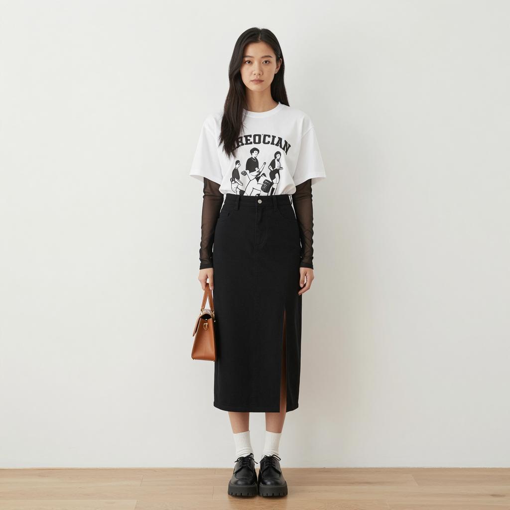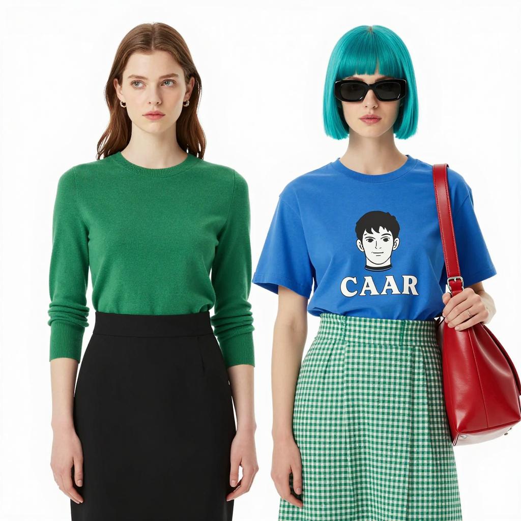 Two women standing side by side. The woman on the left has brown hair, wearing a green long-sleeve top and black skirt, looking slightly to the side. The woman on the right has a teal bob, wearing black sunglasses, a blue t-shirt with a "Captain" graphic, and a green checkered skirt, looking straight ahead. She has a red shoulder bag on her right side. Both hold hands. White background.