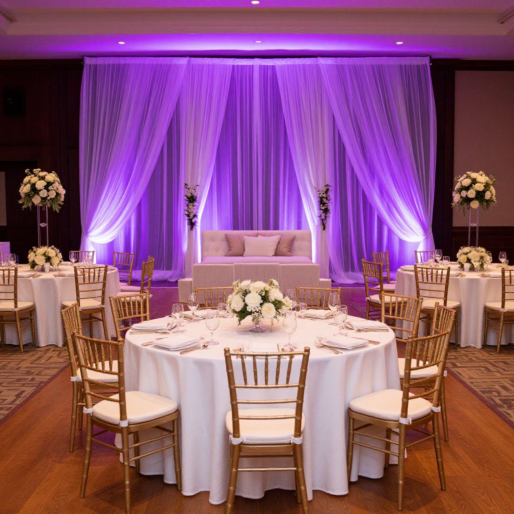 Photograph of an elegantly decorated event space featuring round, white-clothed tables with gold Chiavari chairs. Each table is adorned with white floral centerpieces and silverware. The background showcases a large, draped purple curtain with soft purple lighting, framing a white sofa with two tall floral arrangements on either side. The room has dark walls and a wooden floor with a patterned carpet. The overall atmosphere is sophisticated and romantic, perfect for a wedding or formal event.