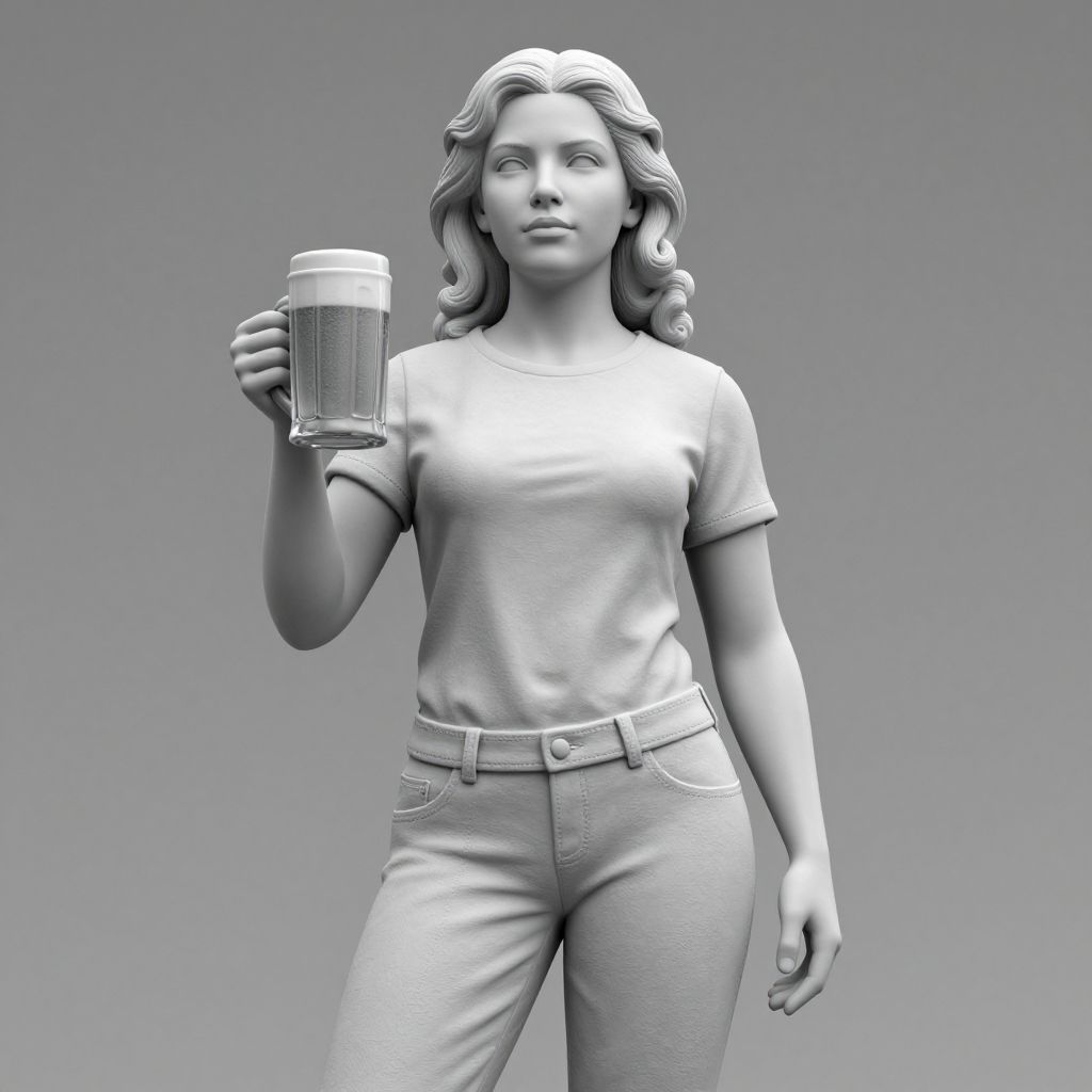 A monochromatic statue of a Latina woman with curly hair, wearing a t-shirt and jeans, holding a beer mug, standing stoically.