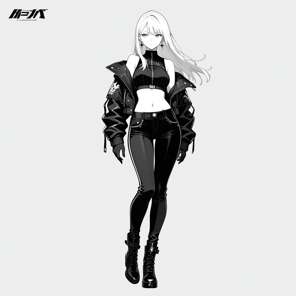 Masterpiece, best quality, original_outfits, 1girl, solo, long_hair, boots, pants, navel, crop_top, jacket, logo, gloves, floating_hair, earrings, off_shoulder, open_jacket, midriff, black_footwear, bare_shoulders, open_clothes, cross_earrings, sleeveless, jewelry, bangs, long_sleeves, lineart, monochrome