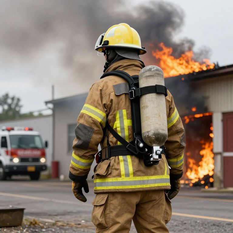 A firefighter in full protective gear, including a helmet, oxygen tank, and flame-resistant suit, standing in front of a burning building, with smoke rising in the background and emergency vehicles nearby.